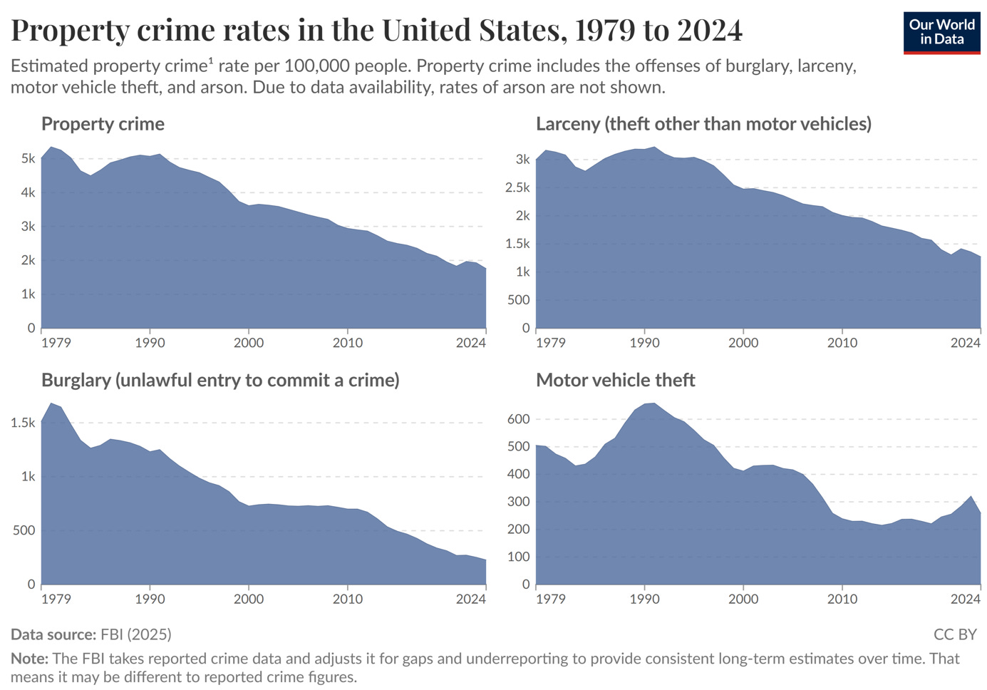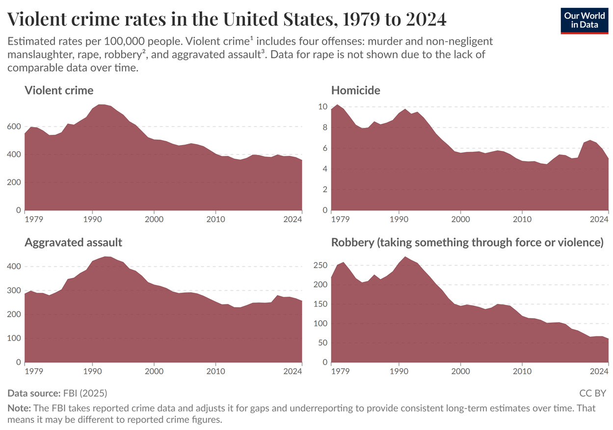 Our World in Data has published some fascinating charts of American crime trends from 1979 to 2024, showing that several crimes affecting ordinary people have seen steep declines. If we include the double-digit falls in 2025, robberies are down by around 80 percent since the peak in 1991, and burglaries have fallen almost 90 percent since 1980. Homicides have not fallen quite as much, but are still down by more than half since 1980.
