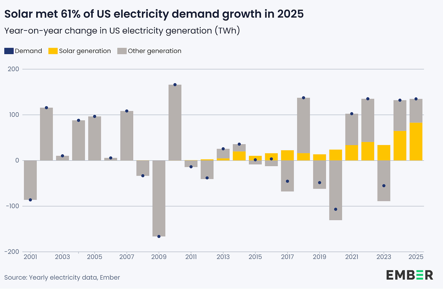 American solar electricity generation grew by a record 27 percent in 2025, to 387 terawatt hours. Overall, American electricity demand grew by 135 terawatt hours (3.1 percent), with solar supplying more than half of that increase. This increase meant that solar accounted for 8.5 percent of total American electricity generation in 2025.