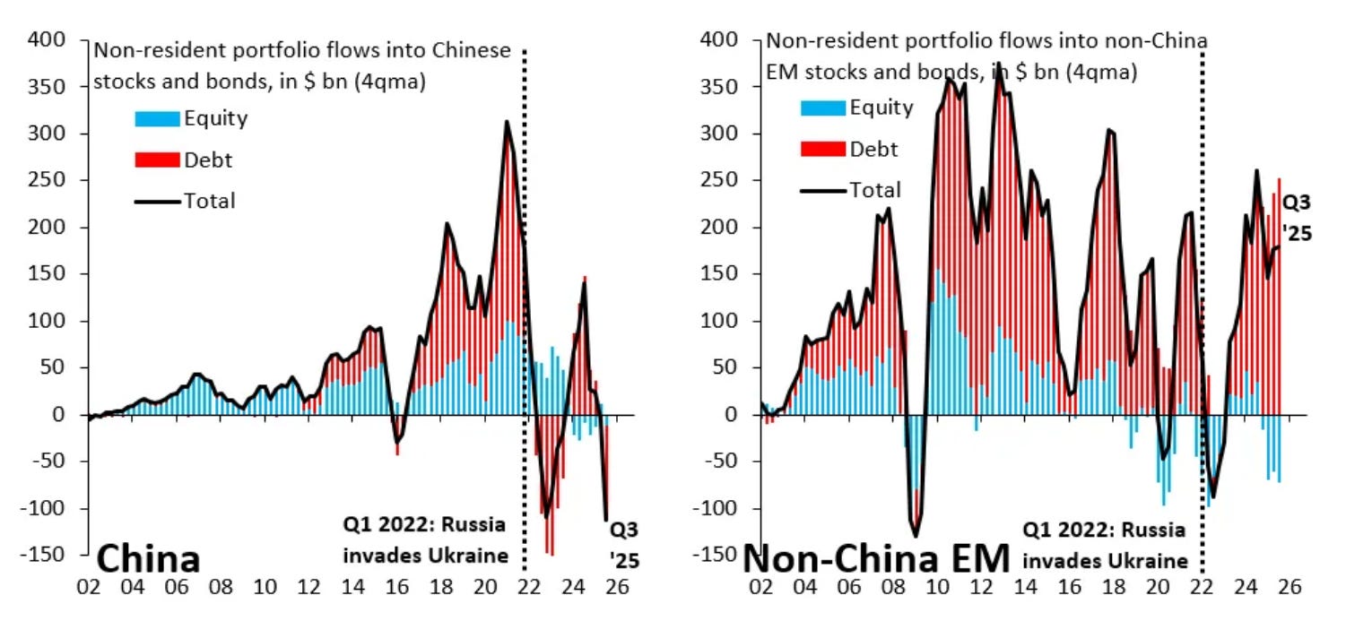 Robin J Brooks instead looks at foreign capital inflows, which surged during Covid but have dried up since 2022. He attributes this to Russia’s invasion of Ukraine – many investors lost money when Western sanctions hit, and Brooks argues they now fear a similar scenario if China invades Taiwan.