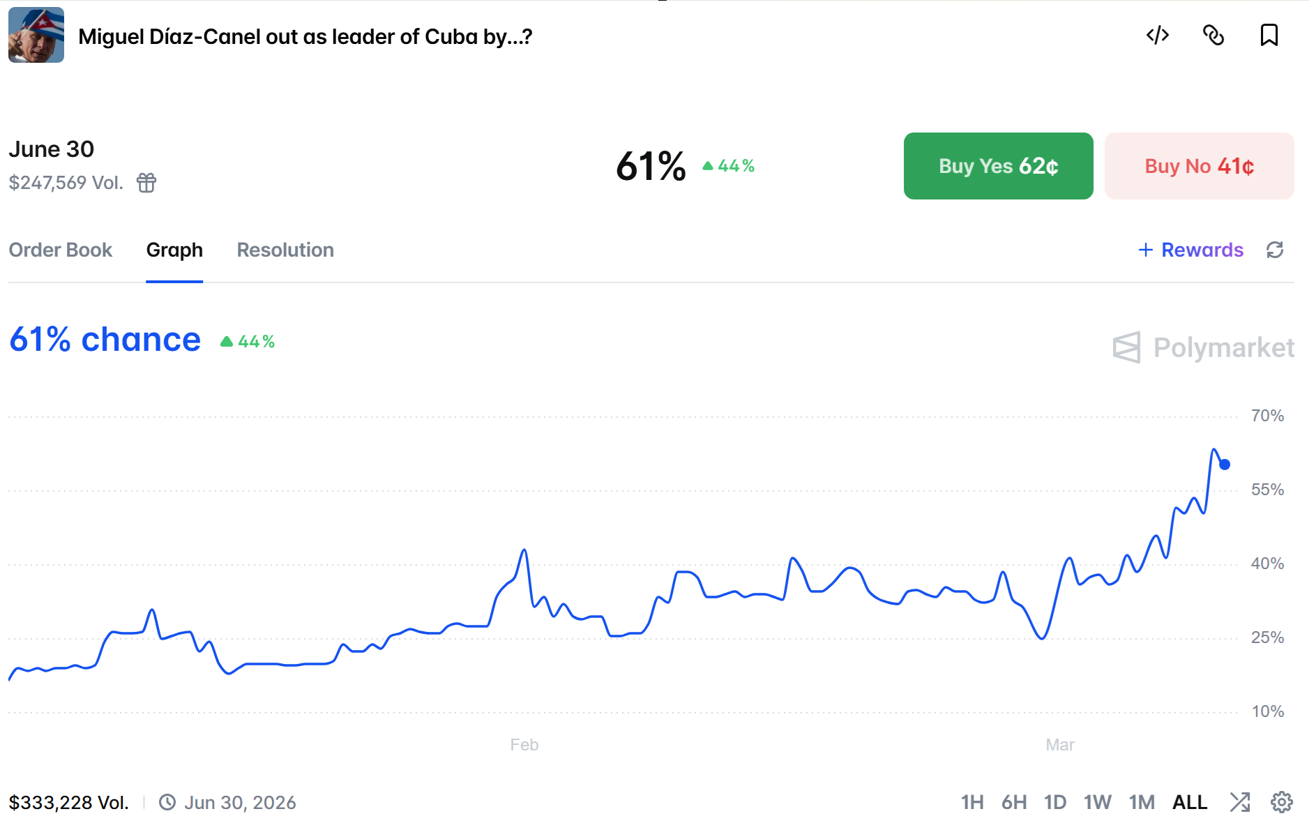 Polymarket gives a 61 percent chance that Cuban leader Miguel Díaz-Canel is out by 30th June