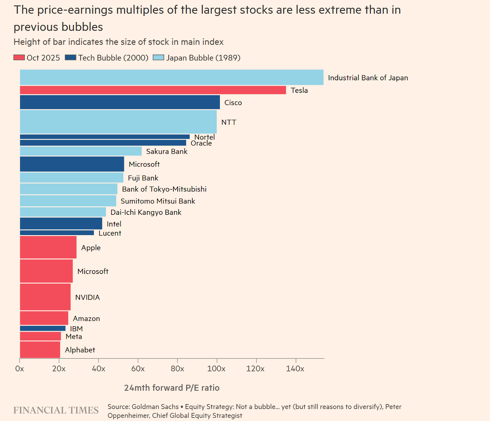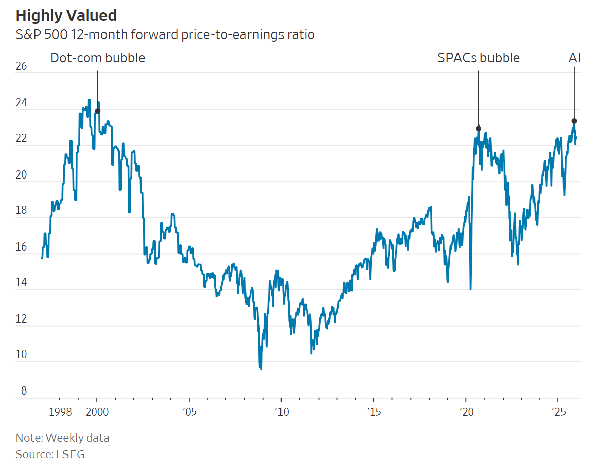 But while the chart is striking, there are some caveats worth adding. The Magnificent Seven aren’t just about cutting-edge AI, but also have – to varying extents – sources of income that could be insulated from a bursting AI bubble. Also, the FT doesn’t include private companies like OpenAI and Anthropic, whose price-to-earnings ratios would likely be higher if they were public. And as James Mackintosh points out in The Wall Street Journal, the price-to-earnings ratio of the S&P 500 as a whole is close to dot-com levels: