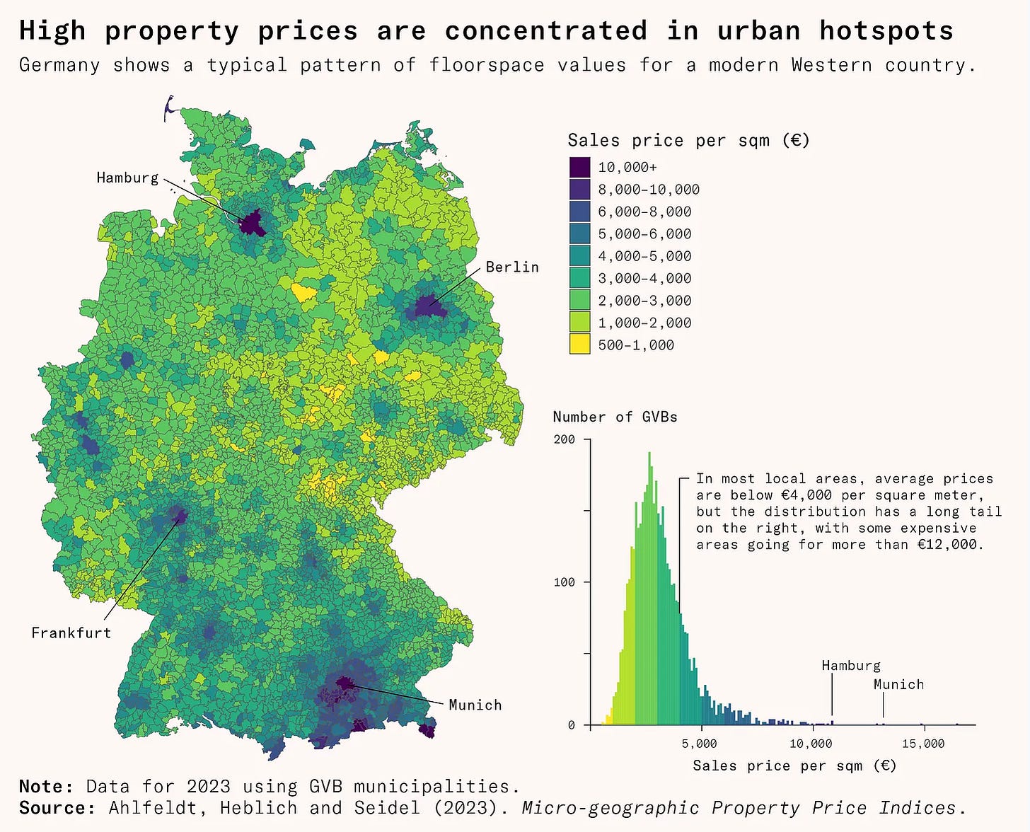 One idea I particularly liked is to have multiple visualizations for the same data. Consider the following visualizations of German property prices. It’s hard to get an intuition for the distribution of different price levels by simply scanning the map, so Saloni added a second visualization specifically about that.