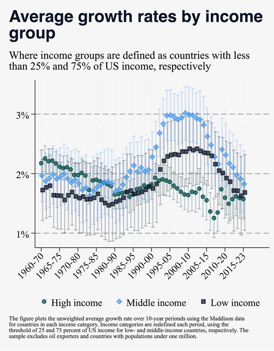 From the 1990s onward, low-income and (in particular) middle-income countries grew much faster than high-income countries, but that has now changed.