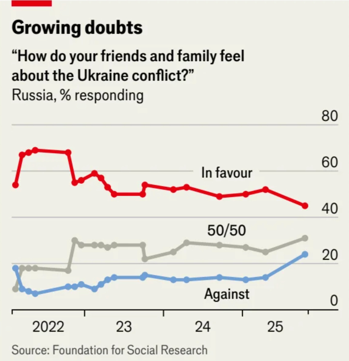 The Economist reports that Russian fatigue over the war may be growing. Since people may not want to share their own views in an authoritarian regime, pollsters have come up with clever indirect techniques. ‘How do your friends and family feel about the Ukraine conflict?’ An increasing number say they’re against it.