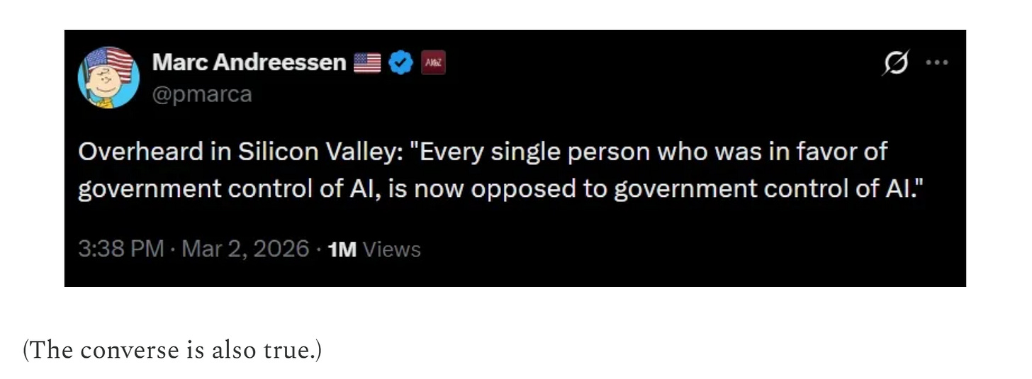 The AI safety community has been naive about its advocacy of regulation in order to stem the risks of AI. And honestly, Anthropic specifically has been naive here in urging regulation, and, for example, in opposing moratoriums on state AI regulation. Which is quite ironic, because I think what they’re advocating for would give the government even more power to apply more of this kind of thuggish political pressure on AI companies.