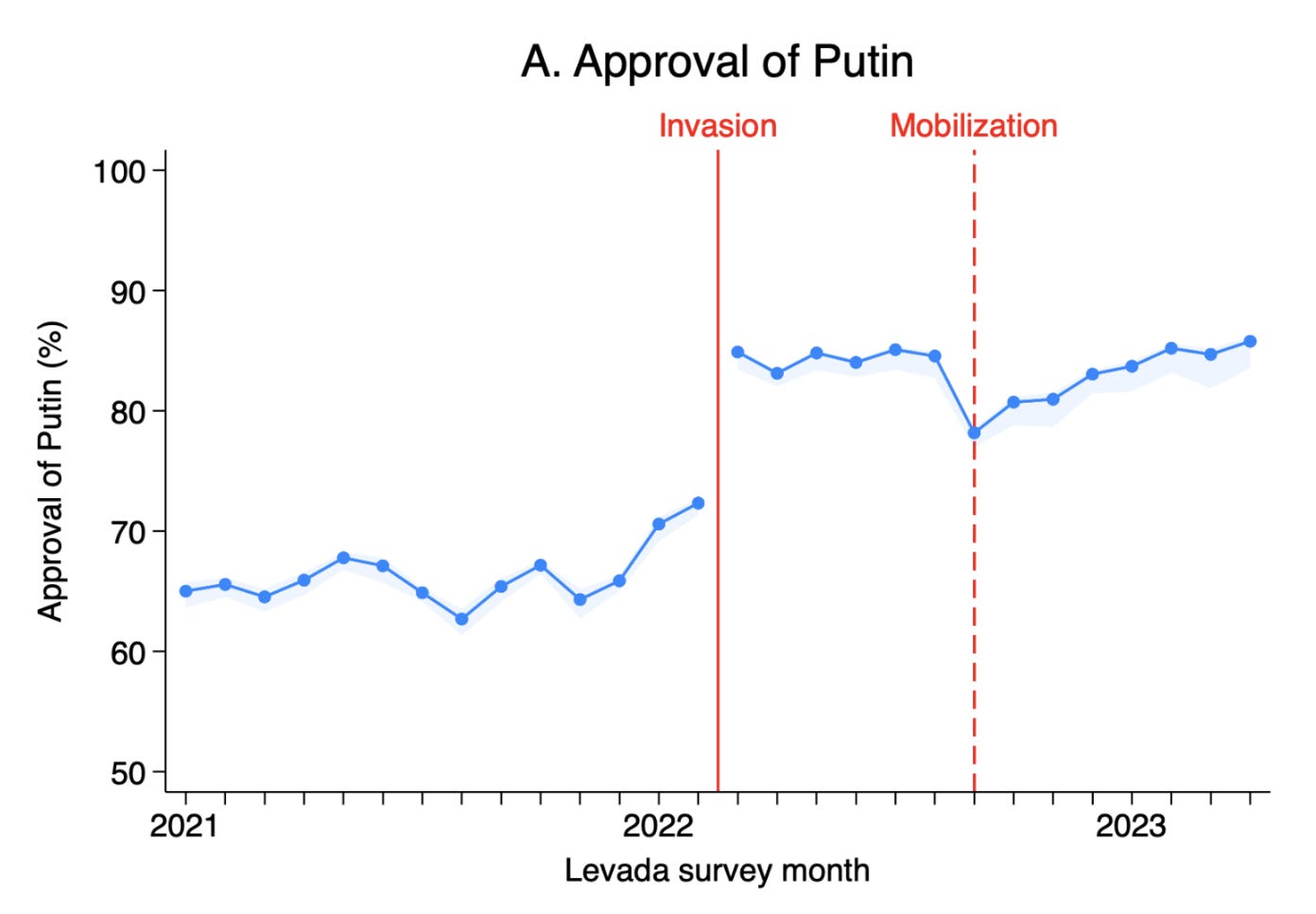 The Russian invasion of Ukraine has been very costly for Russia, with extensive sanctions and more than 200,000 soldiers killed. One might think it would lead to reduced support for President Vladimir Putin, but recent research shows that the invasion strengthened his approval rating by 13 percentage points. This rally ’round the flag effect has continued to hold up, with the mobilization in September 2022 leading only to a temporary blip.
