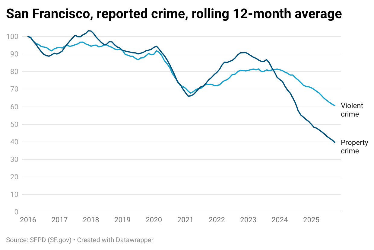 But recently, the trends have reversed. In San Francisco, violent crime has declined by more than a quarter over the past three years, and property crime has dropped by more than half:
