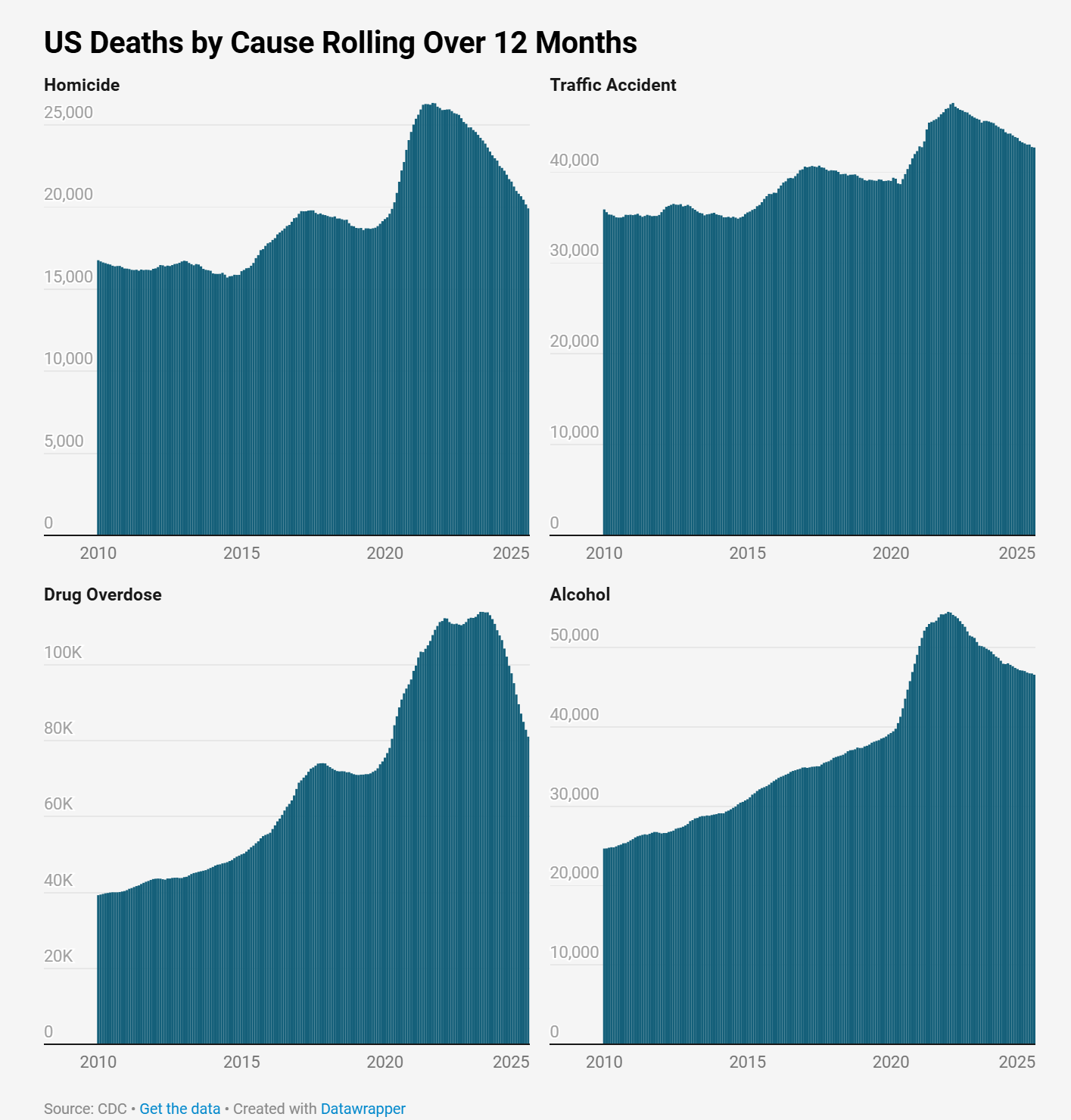 Noah Smith reports on ten positive trends in the US, including falling death rates from multiple causes. The US has long had a lower life expectancy than other rich countries, but now big improvements are underway. Deaths from homicide, traffic accidents, overdoses, and alcohol are all down, and even suicides decreased slightly in 2024. Moreover, the long-term rise in obesity – another leading cause of premature death – began to reverse in 2022, likely thanks to new GLP-1 drugs. It’s striking that so many disparate trends are improving at the same time. If these improvements continue, the US should close some of the life expectancy gap with its peer countries in the years to come.