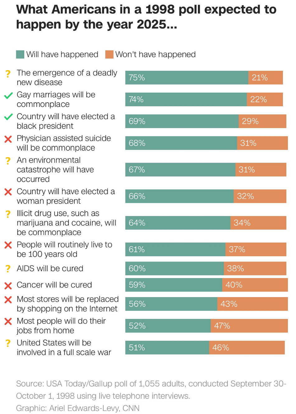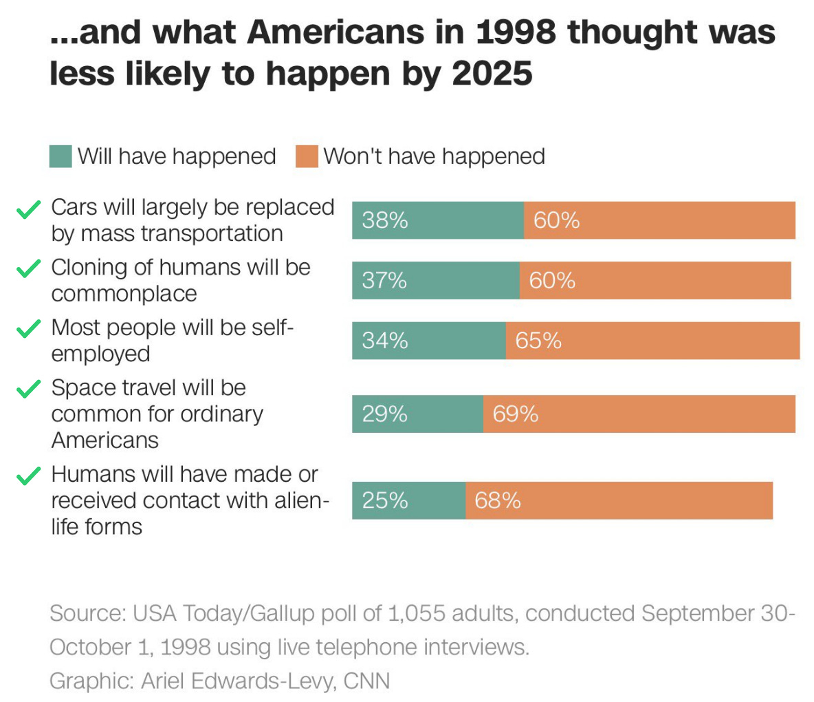 If you ask people whether some future event is going to occur, they are systematically biased toward saying ‘yes’. They overestimate how much things will change. This bias was on full display in a Gallup poll from 1998, which asked Americans what would happen by 2025 (I added the icons).
