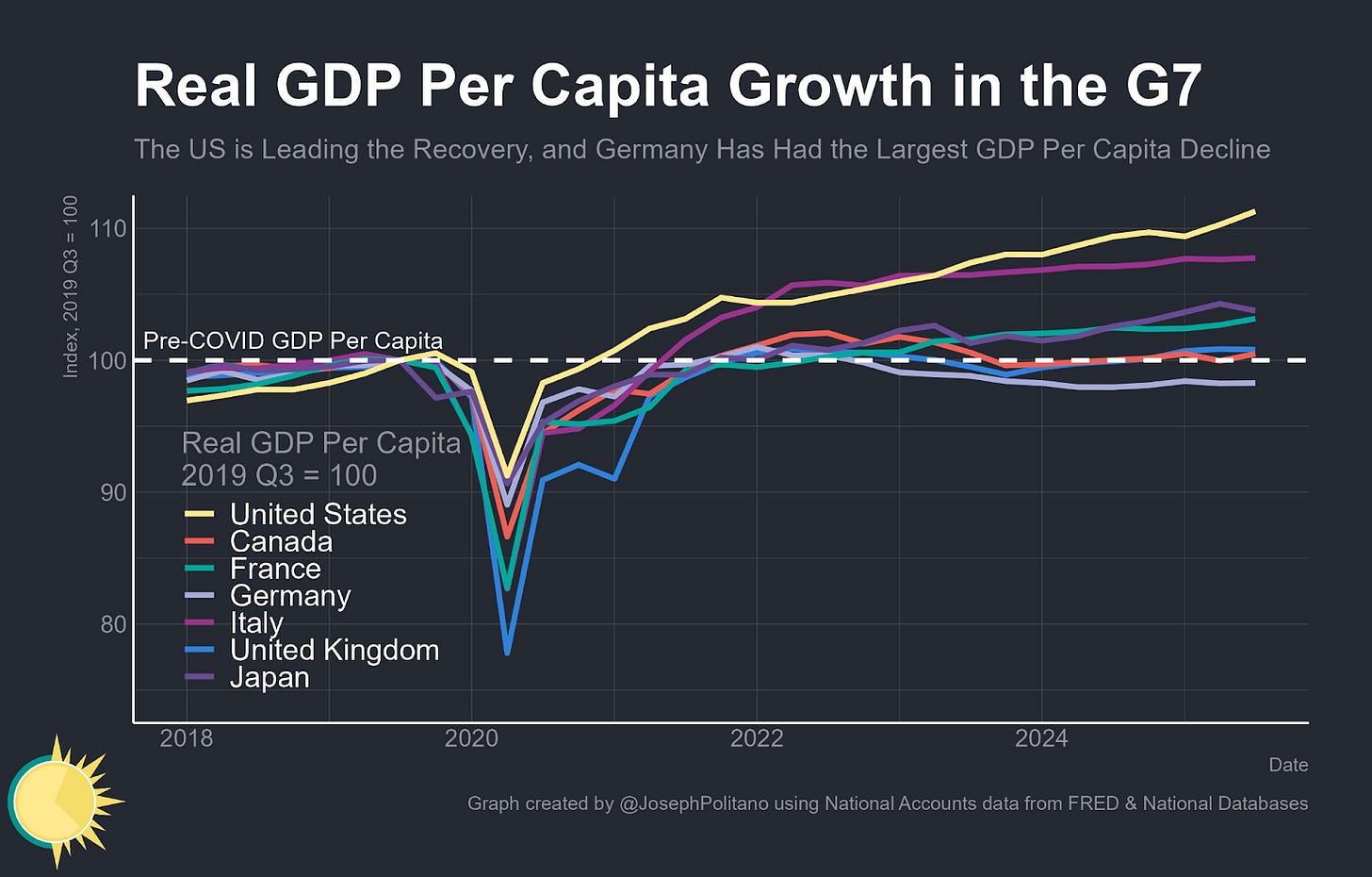 The debate over the Q3 numbers is an example of how we’re often too shortsighted when we discuss economic growth. Given how much it fluctuates between quarters, it tends to be better to zoom out and look at multi-year trends – as in this Joey Politano chart showing how the US has kept outperforming the rest of the G7 since before Covid-19.