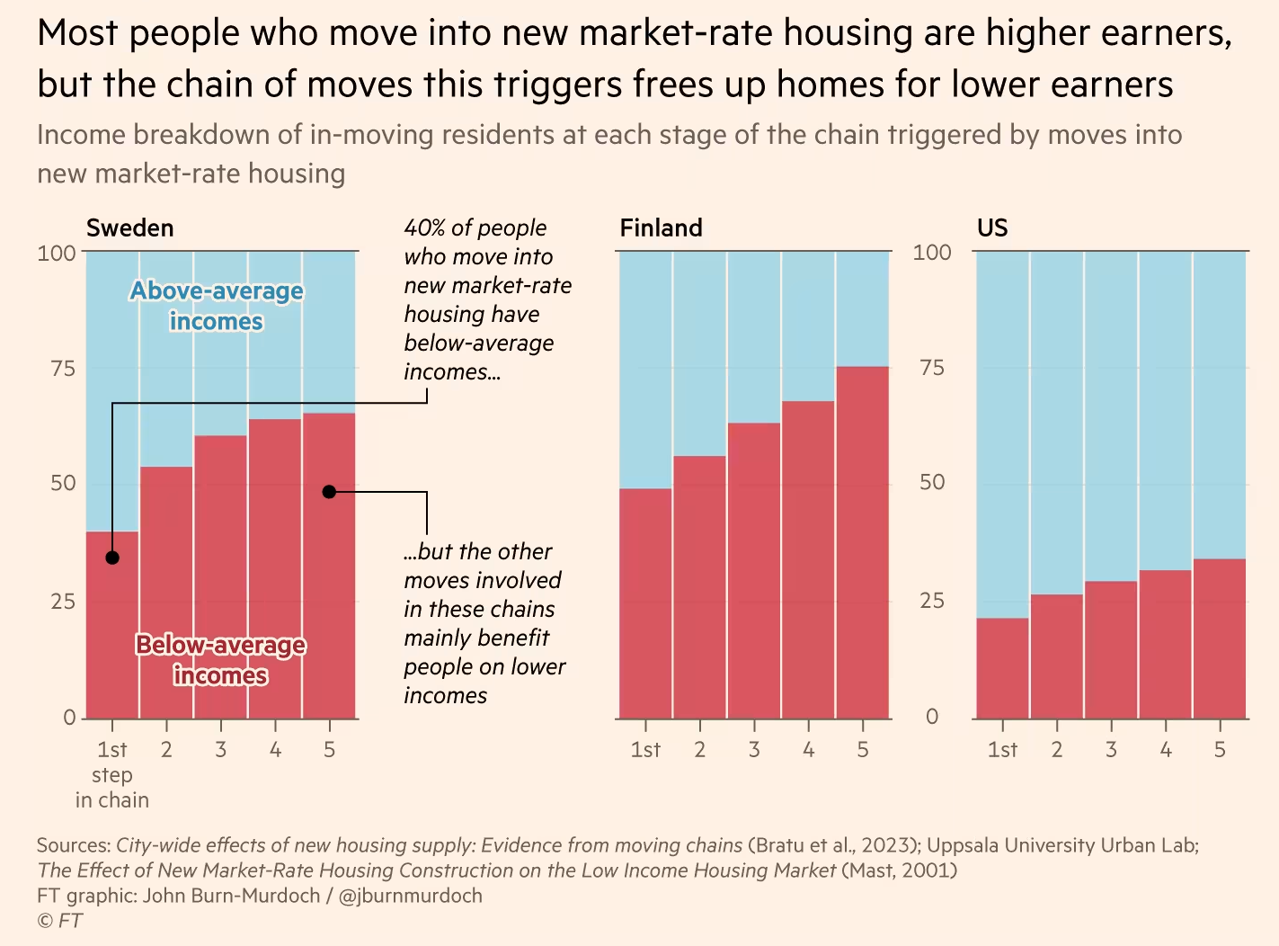 Many people are opposed to new luxury housing, believing that it doesn’t reduce the cost of living for ordinary people. But recently, rents in US cities such as Austin, Denver, and Phoenix have fallen, precisely because of an influx of new luxury apartments. What critics fail to see is that these apartments have knock-on effects on the rest of the market. The luxury apartments themselves may be rented by the affluent – but the homes they leave will go to people further down the ladder, whose homes will in turn become available to still others. Through such moving chains, new luxury apartments free up homes for people with lower incomes and reduce rents across the board.